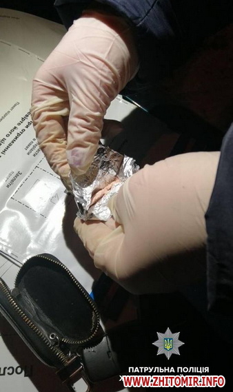 «27 січня, близько 19.00 год., під час патрулювання по проспекту Незалежності за порушення правил дорожнього руху інспектори патрульної поліції зупинили автомобіль Audi. В ході проведення поверхневої перевірки транспортного засобу патрульні поліцейські виявили в салоні автомобіля поліетиленовий пакет зі згортком фольги та пачку цигарок, у котрій знаходився ще один згорток з фольги з порошкоподібною речовиною білого кольору», – інформують у прес-службі. Речник патрульної поліції Житомирської області Ігор Іванюк уточнив Житомир.info, що автомобіль зупинили неподалік Житомирської установи виконання покарань № 8.