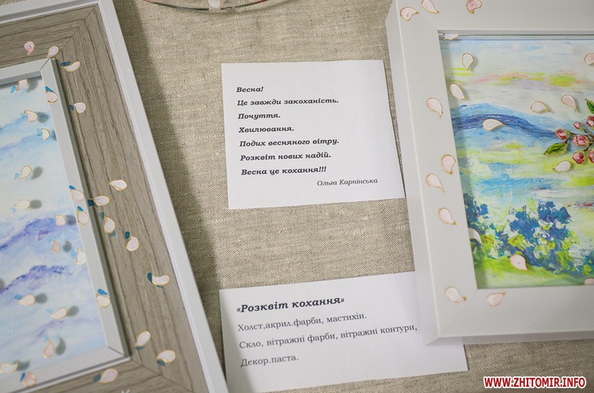 «Назву виставка отримала завдяки найбільш чуттєвим роботам у моїй експозиції, тут я показую свої почуття, відкриваю душу. Під кожною «чуттєвою» роботою написала по декілька слів. Працювати над виставкою почала в кінці листопада минулого року. Коли на вулиці вже був мороз, коли було холодно, у мене на всю буяв яблуневий цвіт – у мене вже була весна. Експозиція присвячена весні, новим почуттям, новим емоціям – всьому, чого ми чекаємо від весни», – розповіла художниця.