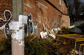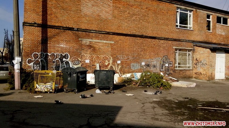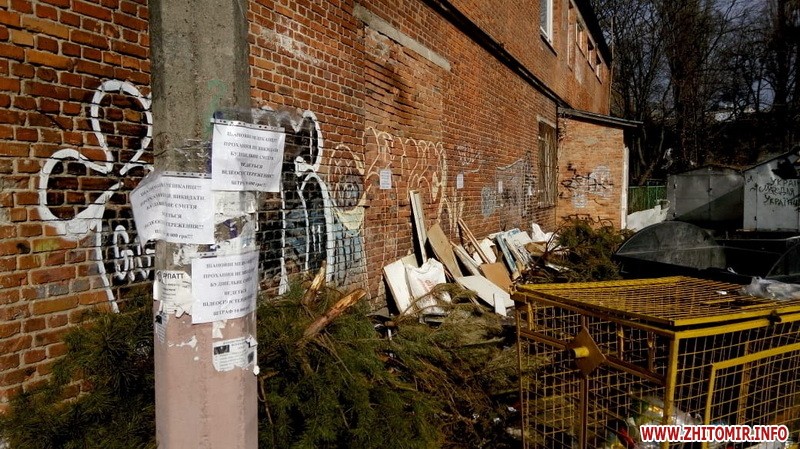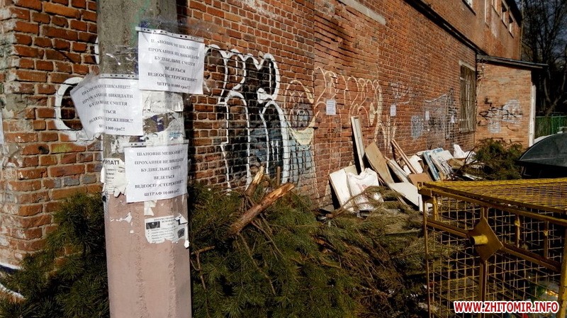 В одному з дворів по вулиці Леха Качинського журналісти Житомир.info натрапили на будівельне сміття, яке винесли особи, що ймовірно, роблять ремонт в одному з навколишніх будинків. Поблизу сміттєвих баків також розвішені оголошення з проханням не викидати будівельне сміття: ведеться відеоспостереження, штраф 10 тисяч гривень.