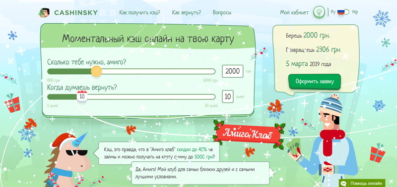 Cashinsky – украинский сервис по выдаче микрозаймов. Он предлагает оформить кредит на карту на сумму от 800 до 5 000 гривен. Сроки варьируются от 5 до 30 дней. Подача заявки, получение денег и отслеживание информации по ссуде происходит онлайн.