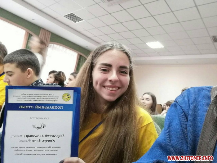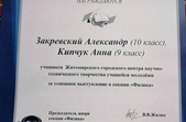 Олександр – 10-класник, Анна – 9-класниця житомирської школи №30, які увійшли до української збірної з 7 чоловік. На конференції вони познайомилися з досвідченими вченими та школярами-дослідниками з України, Білорусії та Росії. За результатами виступу житомиряни отримали відзнаку членів журі – похвальний відгук голови журі секції «Фізика».