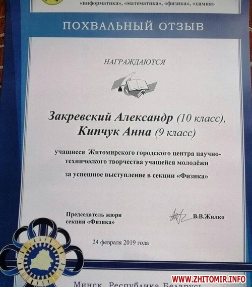 Житомирські старшокласники Анна Кіпчук та Олександр Закревський отримали відзнаку на ХХІІІ Міжнародній конференції-конкурсі робіт дослідницького характеру, яка 22-24 лютого пройшла у столиці Білорусі – місті Мінськ.