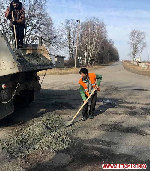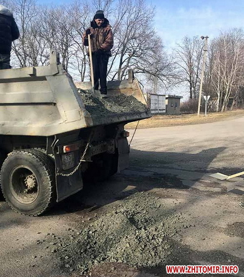 28 лютого на дорозі між селом Романівка на містом Чуднів Житомирської області засипали ями відсівом, купленим місцевими підприємцями.