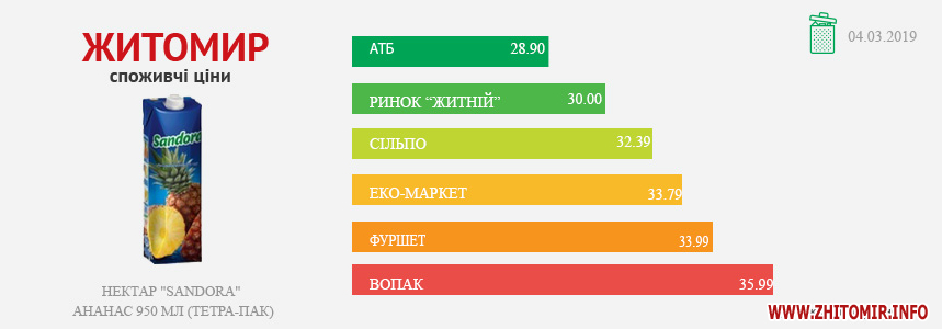 МОНІТОРИНГ ЗДІЙСНЕНО МЕТОДОМ КОНТРОЛЬНОЇ ЗАКУПІВЛІ, У МІСЦЯХ ПРОДАЖУ: AТБ, пр. Миру, 15 А, Ринок "Житній", майдан Житній ринок, ЕКО-маркет, вул. Мала Бердичівська, 2/7,Сільпо, майдан Житній ринок, 1, Фуршет, вул. Вітрука, 9 а, Вопак, вул. Київська, 87