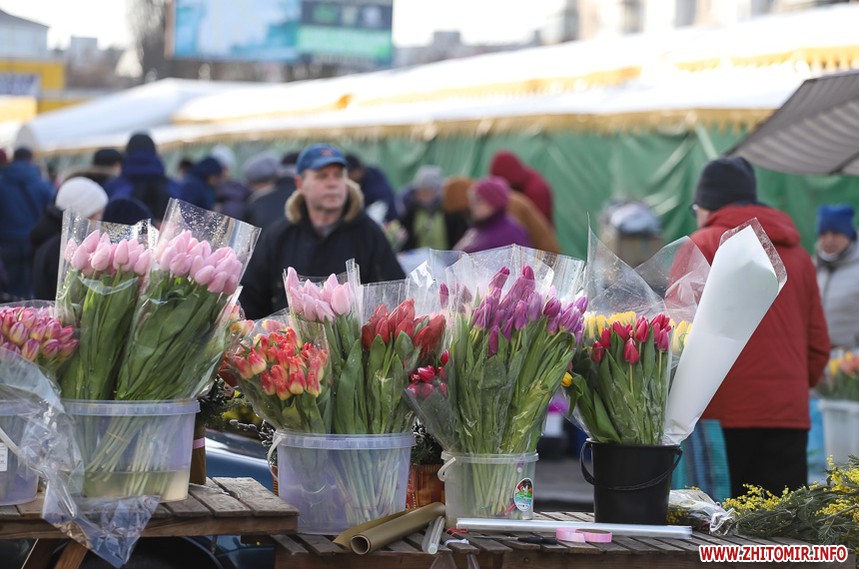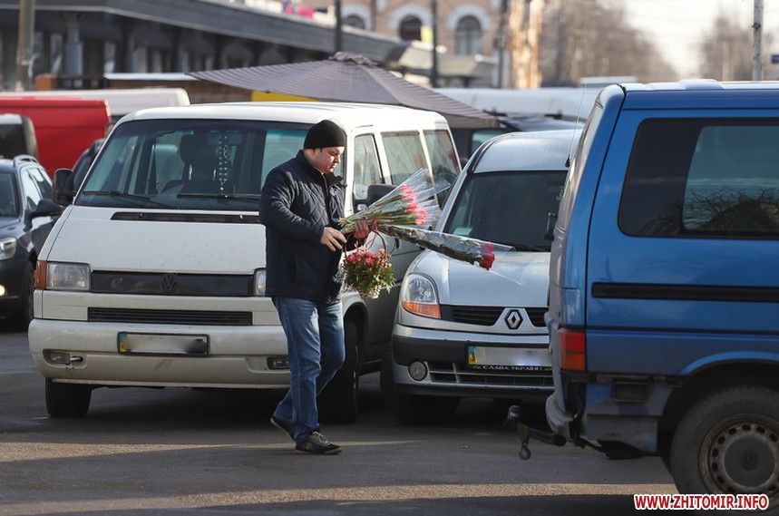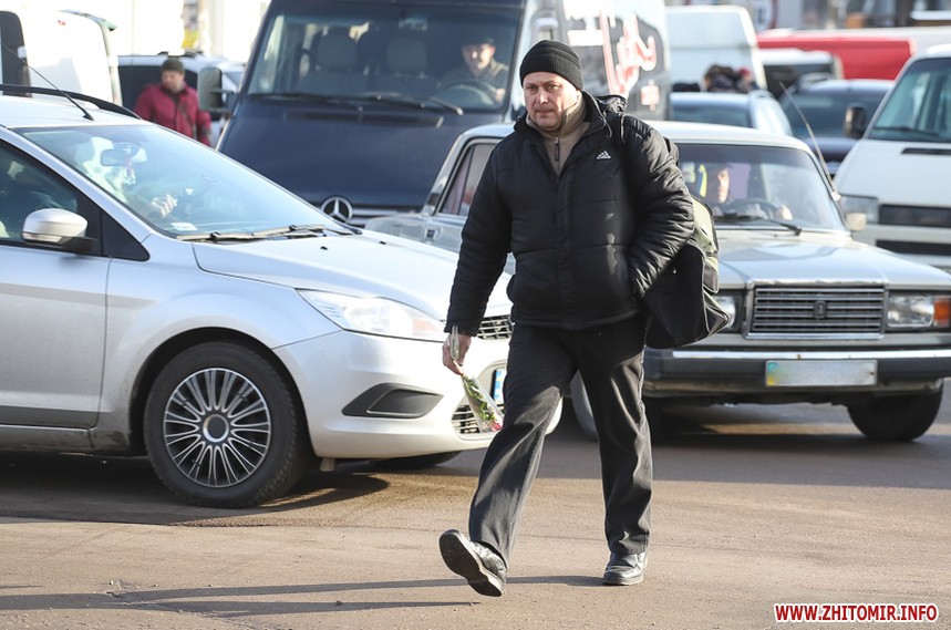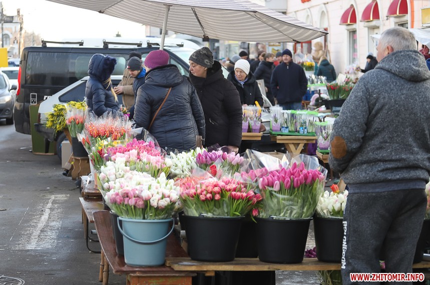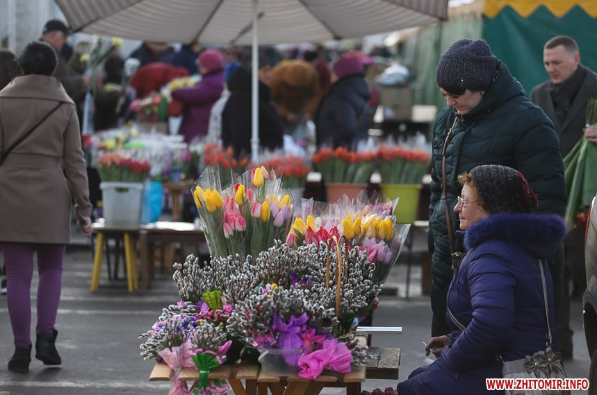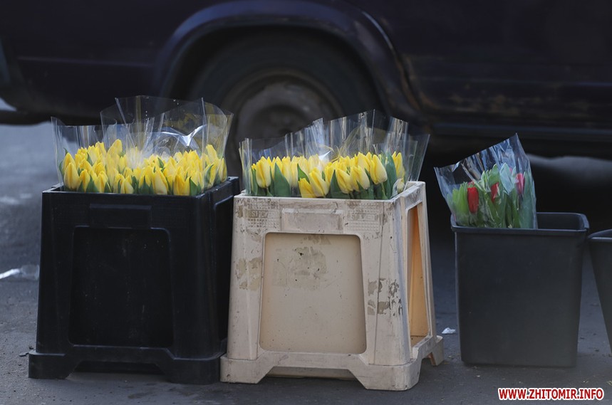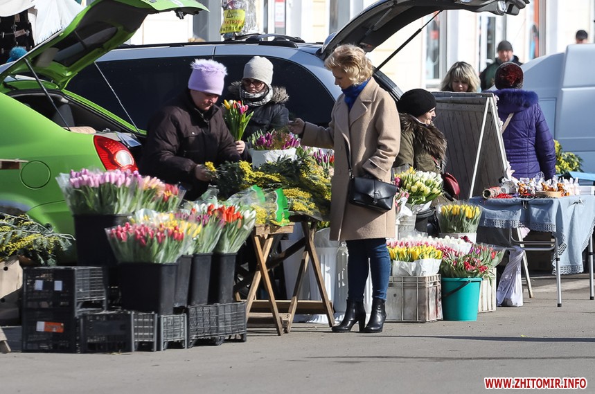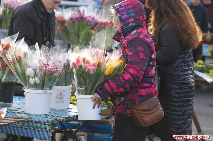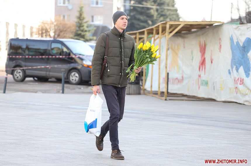 Квіти – традиційний дарунок жінкам до 8 Березня, тож у переддень свята чоловіки в Житомирі від ранку «атакують» точки продажу барвистих символів весни та ніжності.