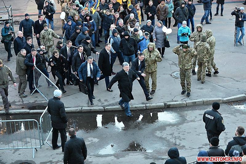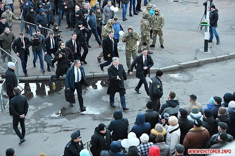 «Користувачі соцмережі обговорюють фото президента Петра Порошенка в Житомирі, який біжить по калюжі. Відповідний знімок з'явився у Faceboоk. За їхньою інформацією, президент "втік" зі свого передвиборчого мітингу в Житомирі, після того, як місцеві мешканці досить холодно його зустріли. На фото видно, як Порошенко біжить по калюжі, тоді як його наздоганяють охоронці», - пише сайт «Кореспондент».