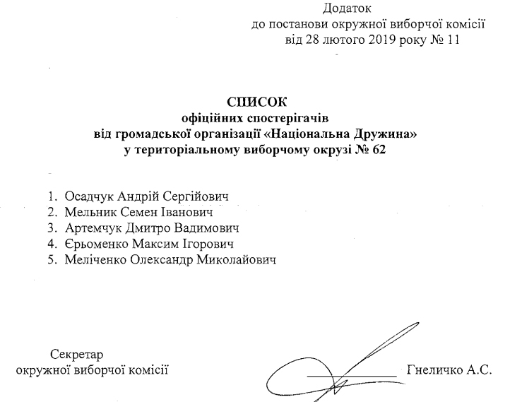 «Зареєструвати офіційних спостерігачів на чергових виборах Президента України 31 березня 2019 року від громадської організації «Національна Дружина» у територіальному виборчому окрузі №62 згідно з додатком. Видати офіційних спостерігачам посвідчення за формою, встановленою Центральною виборчою комісією», - йдеться у постанові ОВК.