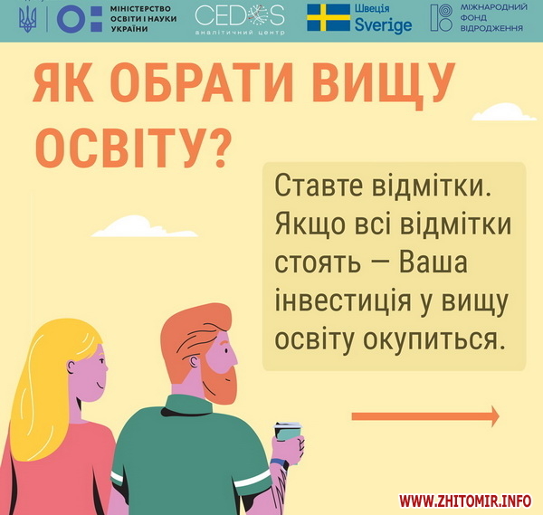 «Можу одразу зробити спойлер: чим більше відміток ви поставите, тим вигіднішим буде вкладення. І тут не йдеться лише про оплату за навчання, на яке витрачаєте кошти ви самі або держава. Насамперед, доки ви вчитеся, ви щомісяця втрачаєте ту зарплату, яку могли б отримувати, якби пішли працювати одразу після школи або відучившись у технікумі. Саме тому дуже важливо, щоб обрана вами вища освіта була якісною. Тоді вона дозволить «відбити» зроблену інвестицію», – зауважив директор CEDOS Єгор Стадний.