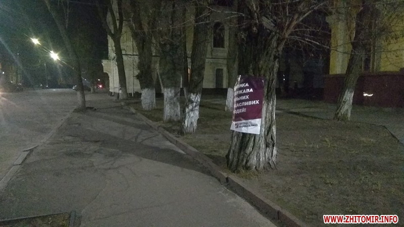 На початку тижня на Пушкінській та Старому бульварі в Житомирі плакатами з передвиборчою агітацією обклеїли стовбури дерев, стовпи та паркани.