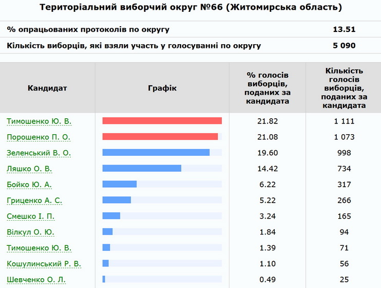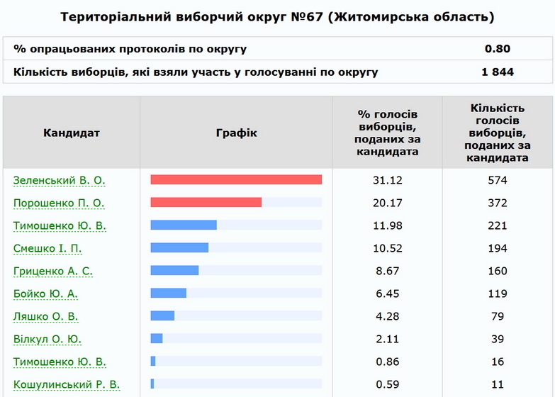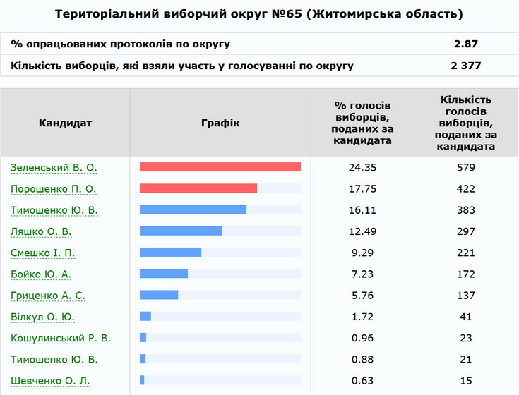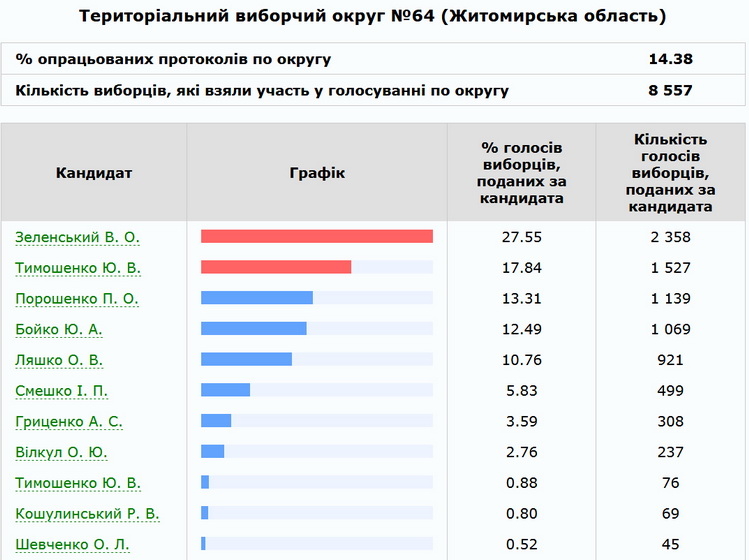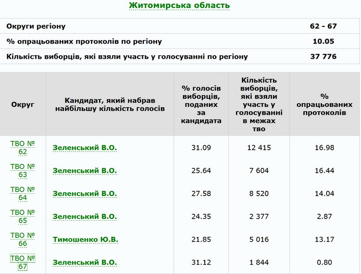 В п’яти ТВО лідирує кандидат Володимир Зеленський, в Малинському окрузі поки що лідер Юлія Тимошенко. Найбільший відсоток протоколів ЦВК вже отримала від округів №62 (Житомир) та №63 (Бердичів), найменший – від Новоград-Волинського округу №65 та Чуднівського округу №67, куди входить частина Житомира.