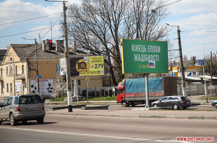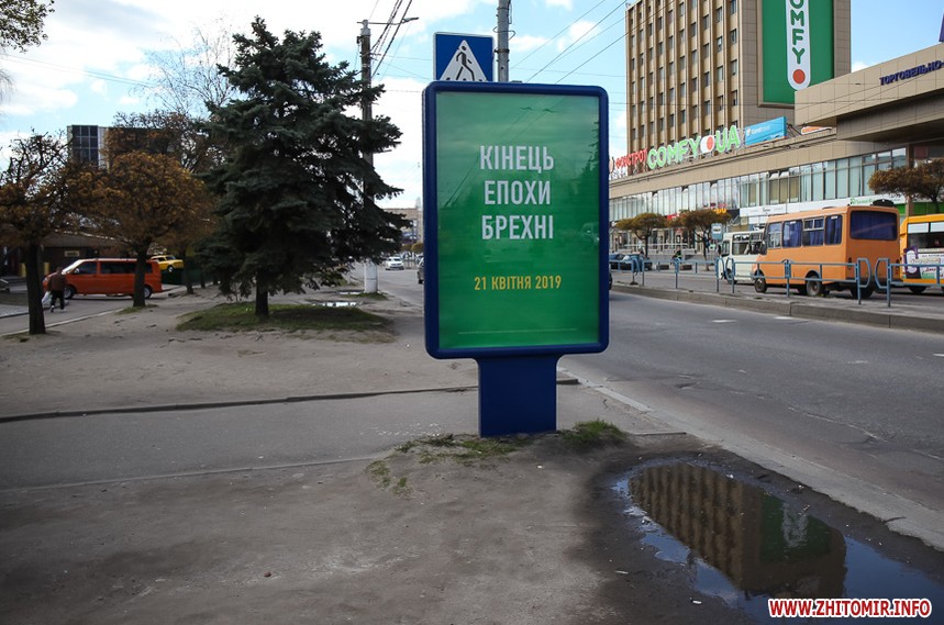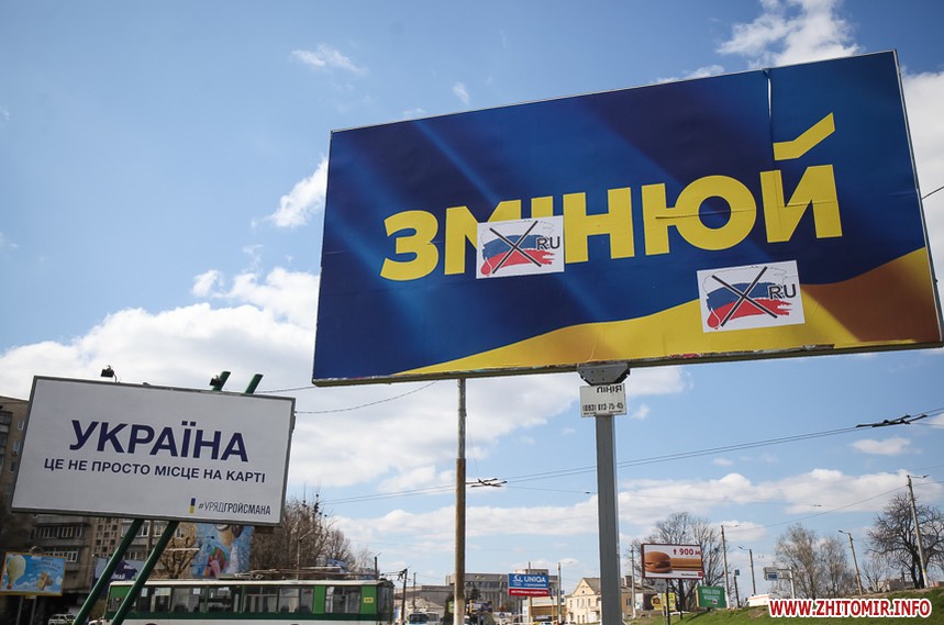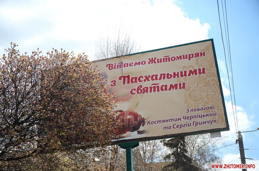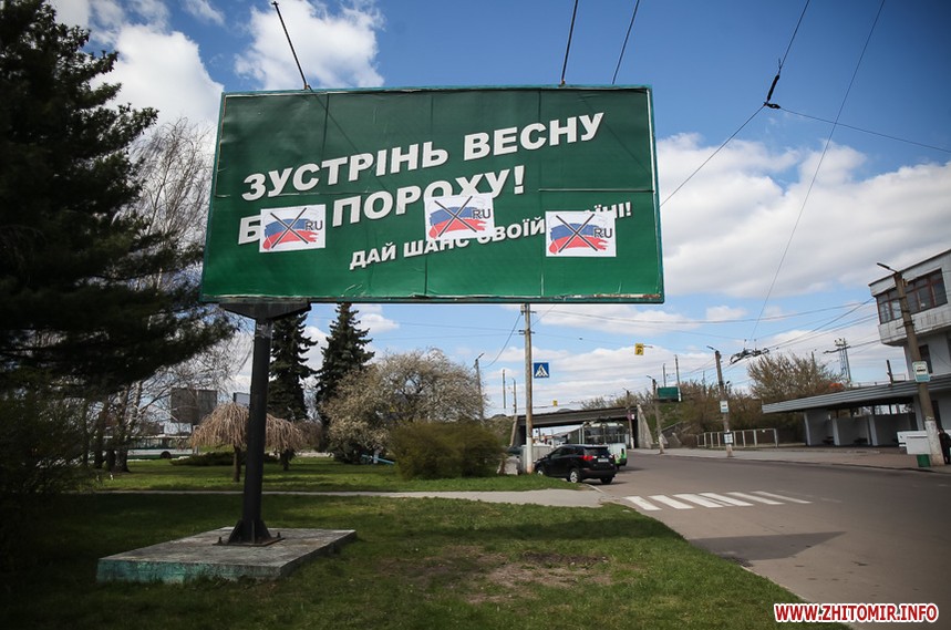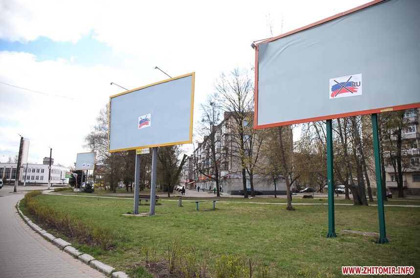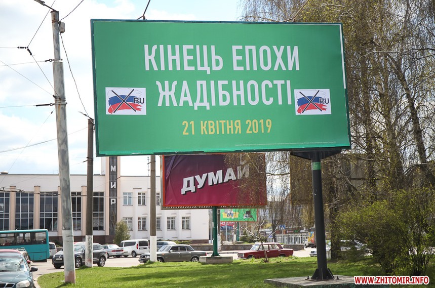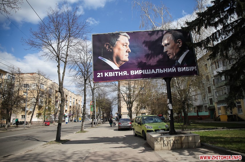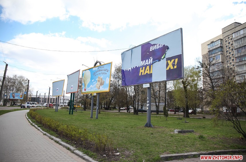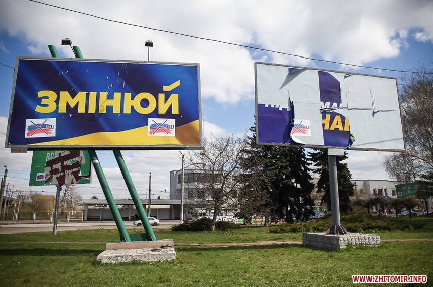 Також залишилося багато реклами, яку кандидати в президенти розвішували перед «днем тиші». Деякі з цих бордів вже обдерті та мають непривабливий вигляд, на деяких з’явилися наліпки з російським прапором, які ліпили на політичну рекламу в Житомирі та Бердичеві під час підготовки до голосування 31 березня. Наліпки з російським триколором також є й на нових «зелених» білбордах одного з кандидатів в президенти.