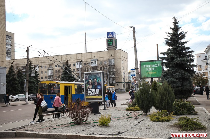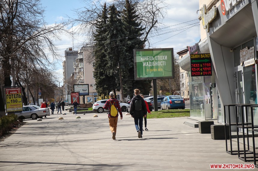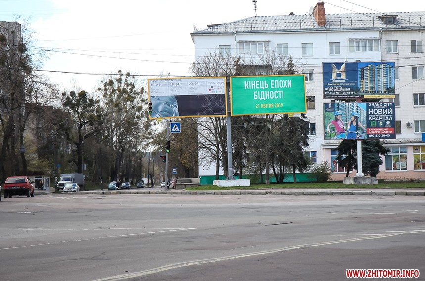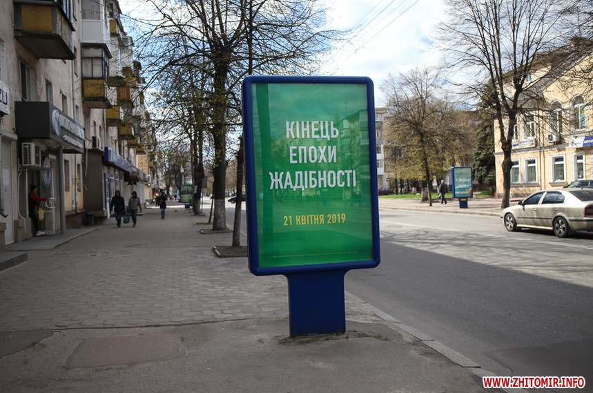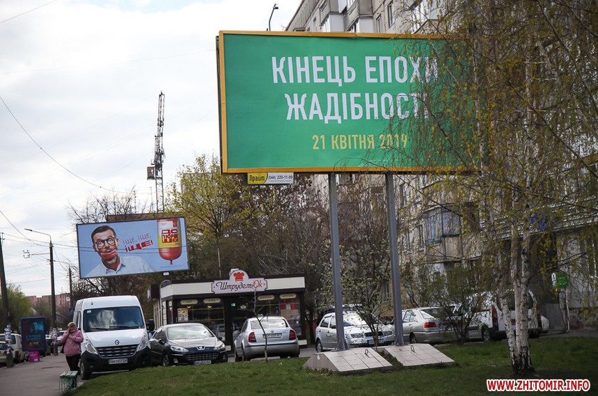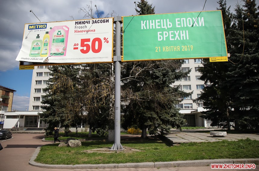 За тиждень до дня повторного голосування, яке відбудеться 21 квітня 2019 року, у Житомирі почали з’являтися оновлені агітаційні білборди кандидатів у президенти Петра Порошенка та Володимира Зеленського. Станом на 15 квітня в центрі міста агітації останнього значно більше і лише на вулиці Київській вдалося побачити білборд з Порошенком та Путіним, хоча в деяких містах України після шквалу критики такі борди переклеїли. Є у центрі й реклама Уряду Гройсмана з гаслом «Україна це не просто місце на карті» на білому фоні.