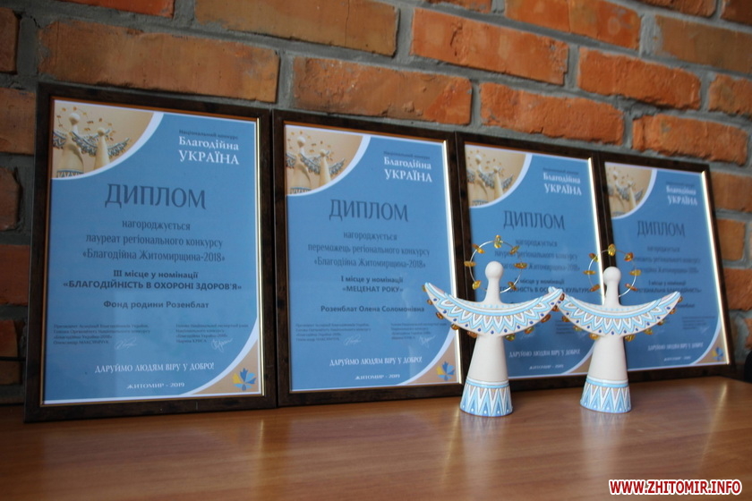 «Вже кілька років поспіль організатори конкурсу «Благодійна Житомирщина» об’єднують однодумців - тих, хто власним прикладом показує, що варто робити добрі справи, - каже Олена Розенблат. – З кожним новим роком наш Фонд долучається та втілює у життя все більше нових проектів у різних сферах».