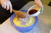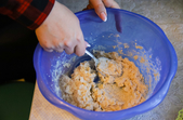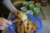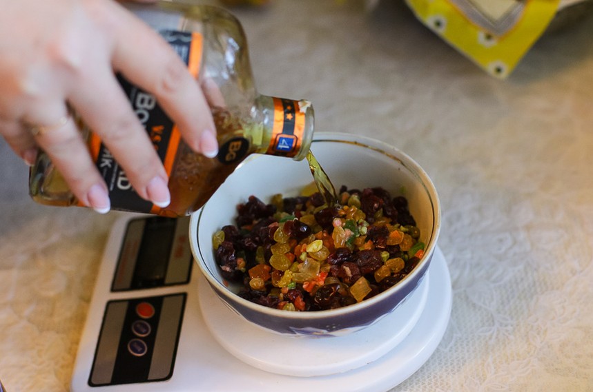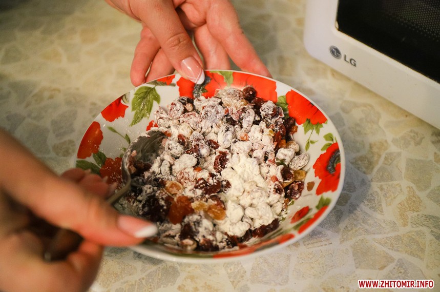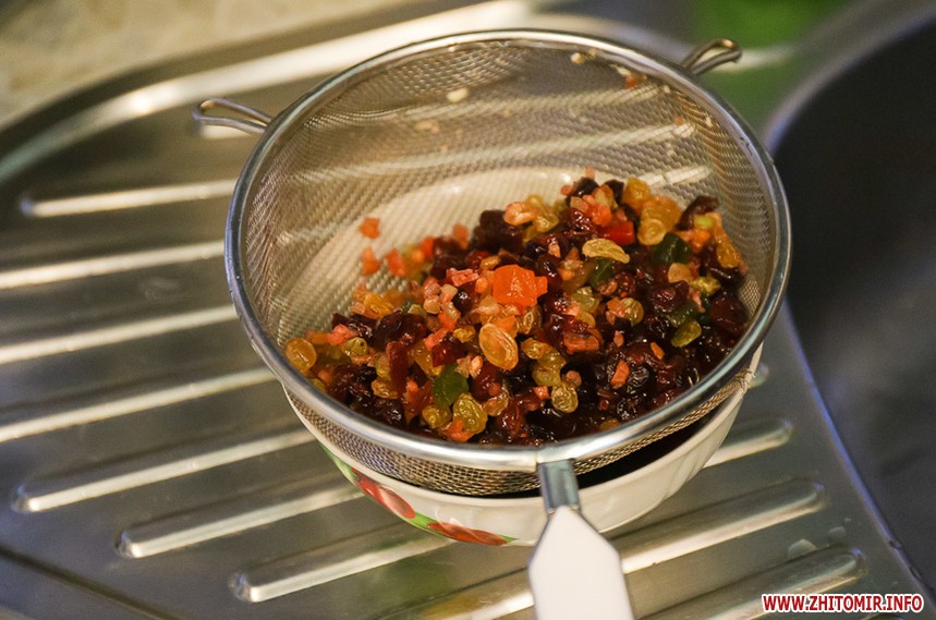 Зливаємо алкоголь з сухофруктів, його ми потім додамо у тісто. Сухофрукти обвалюємо у борошні, щоб вони рівномірно розподілилися у тісті. У тісто, що підійшло, додаємо алкоголь з сухофруктів, самі сухофрукти, і вимішуємо вдруге, щоб рівномірно розподілити сухофрукти.