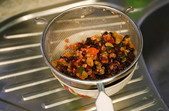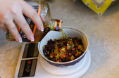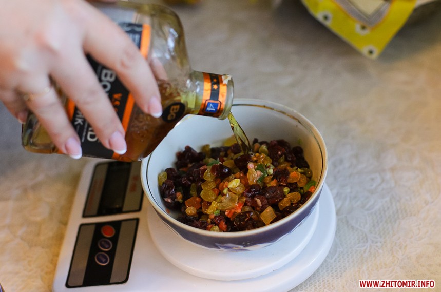 Всі інгредієнти мають бути кімнатної температури. Починаємо з сухофруктів. Замочуємо їх окропом на одну хвилину, потім відціджуємо та заливаємо міцним алкоголем. Я використовую суміш коньяку та вишнівки. Чим довше вони так простоять – тим краще. Можна залишити їх навіть на 6-8 годин.