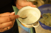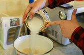 Далі готуємо опару. Для цього насипаємо у ємність 125 грам борошна і заливаємо його 300 мл киплячого молока. Перемішуємо, доки не залишиться грудочок, і відставляємо охолоджуватися.