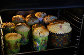 У розігріту до 190 градусів духовку ставимо паски, попередньо змастивши збитим яйцем, та печемо до готовності. Готовність перевіряємо дерев’яною паличкою. Перші хвилин 10-15 духовку не можна відкривати, щоб паски не «опали».