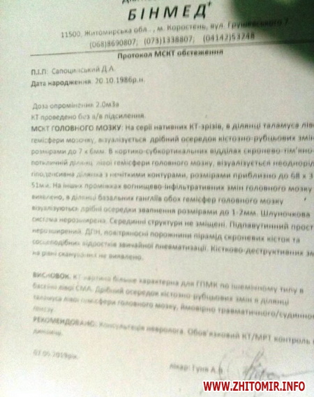 «Дуже потрібна ваша допомога ветерану АТО Дмитру Сапоцинському, псевдо – Метис, 1986 р. н.(був у 8 полку та 92 бр.), який знаходиться у неврологічному відділенні м. Малина Житомирської обл. з діагнозом «гостре порушення мозкового кровообігу (інсульт)». Так сталось, що у Дмитра нікого поряд з сім’ї нема, мама в Росії ,тато помер, підтримує його громадянська дружина Оксана та кума Світлана», – йдеться у дописі.