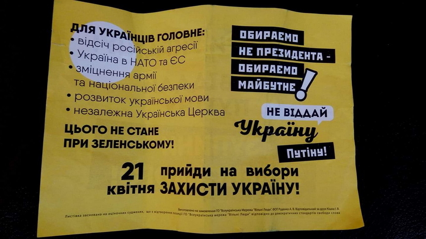 Нагадаємо, 18 квітня, перед другим туром виборів президента, ввечері на Михайлівський роздавали листівки з написом «Захисти Україну! Не віддай Путіну. Зупини Зеленського». Наступного дня поліція повідомила, що двох розповсюджувачів листівок поліцейські встановили: відносно 27-річного бердичівлянина та 25-річного житомирянина складено матеріали за статтями 212-13 (Виготовлення або розповсюдження друкованих матеріалів передвиборної агітації, які не містять відомостей про установу, що здійснила друк, їх тираж, інформацію про осіб, відповідальних за випуск) та 212-14 (Порушення порядку розміщення агітаційних матеріалів чи політичної реклами або розміщення їх у заборонених законом місцях) Кодексу України про адміністративні правопорушення.