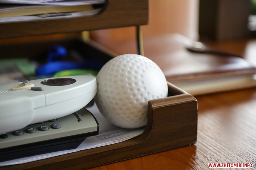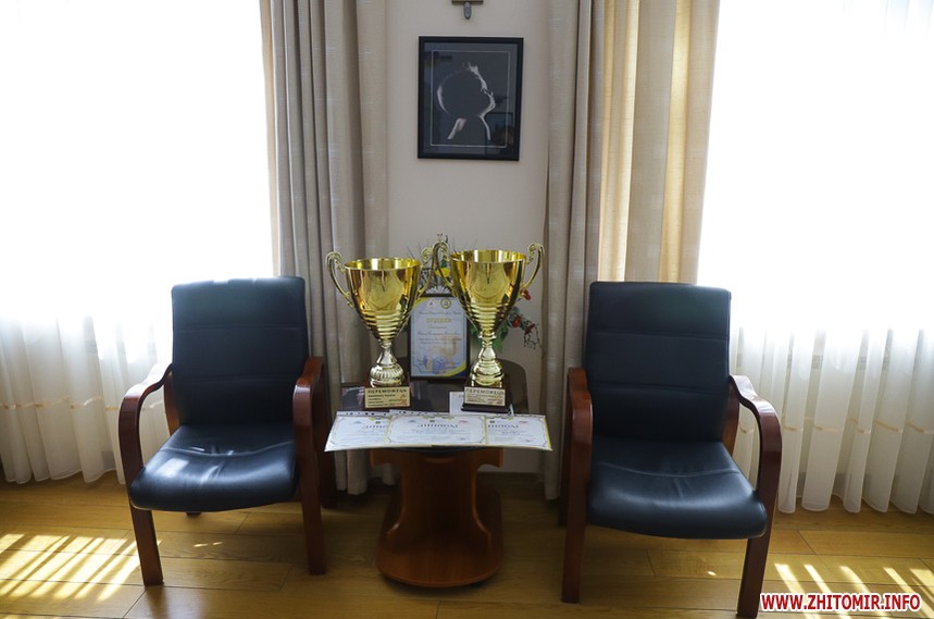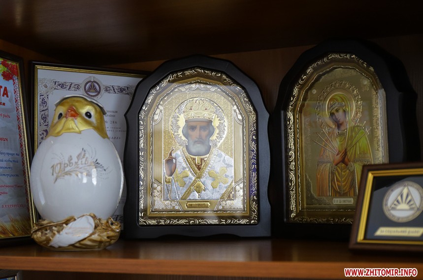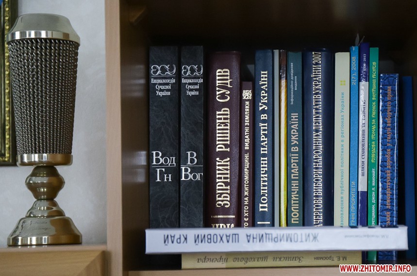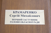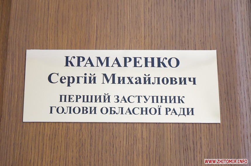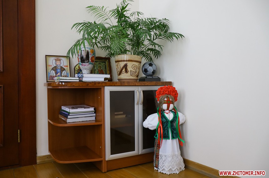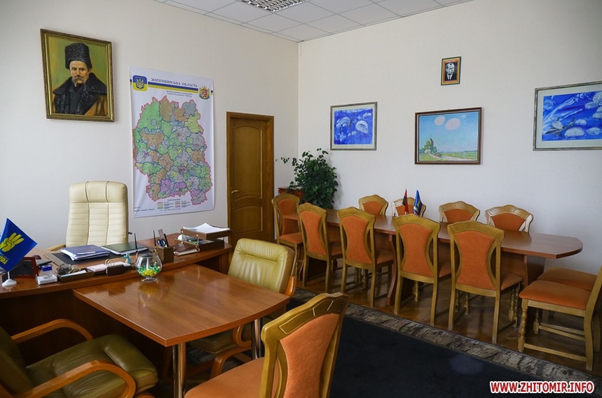 У кабінеті першого заступника голови Житомирської облради Сергія Крамаренка на полицях булава, ікони, бюст Івана Франка з медалями, кубки, грамоти і нагороди. Живі рослини тут не в пошані, проте на підвіконні ваза з колосками пшениці.