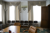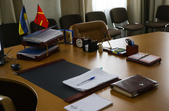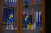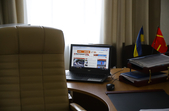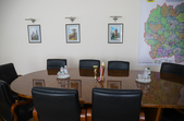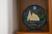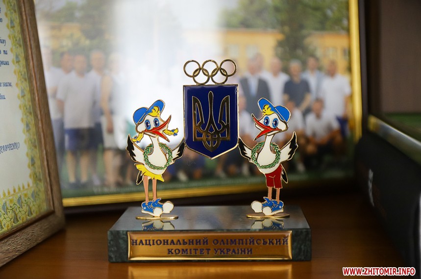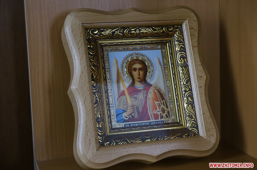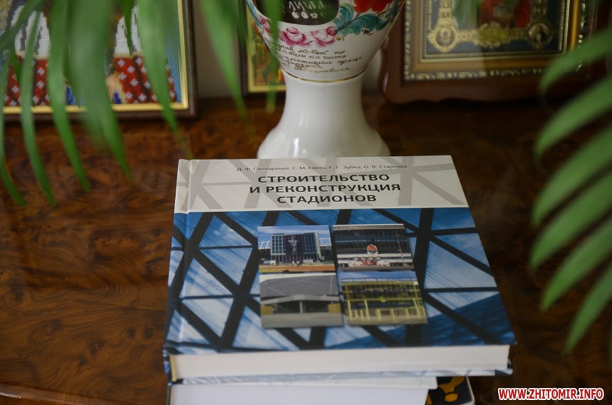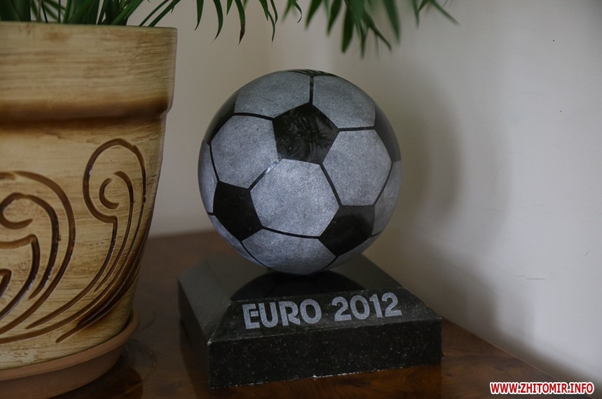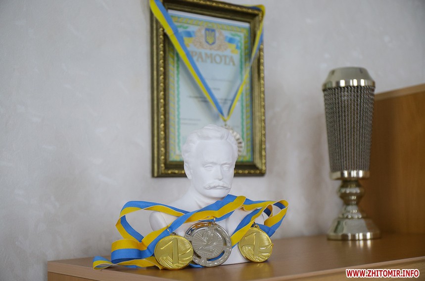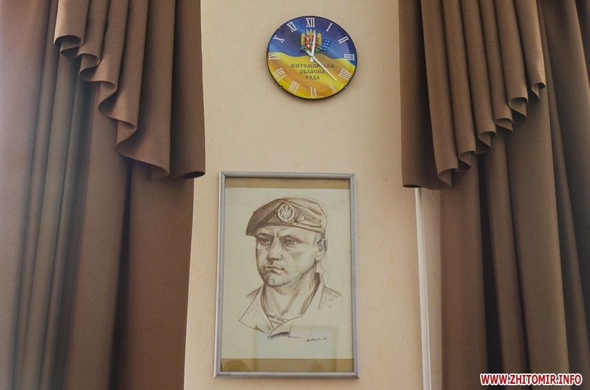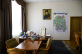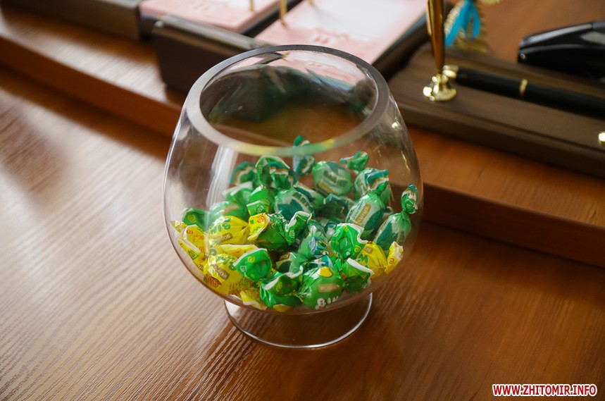 У кабінеті першого заступника голови Житомирської облради Сергія Крамаренка на полицях булава, ікони, бюст Івана Франка з медалями, кубки, грамоти і нагороди. Живі рослини тут не в пошані, проте на підвіконні ваза з колосками пшениці.