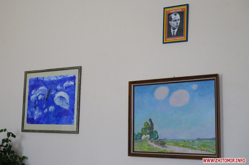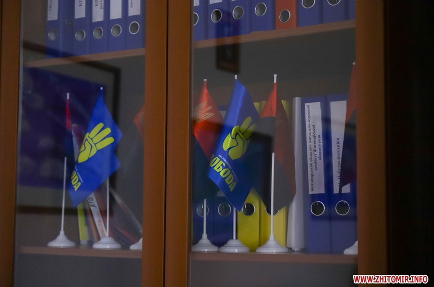 У кабінеті ще одного заступника голови облради Максима Вілівчука поряд з прапорцями Житомирської області можна помітити багато червоно-чорних прапорців та з символікою ВО «Свобода». Поряд з робочим столом – для гостей заготовлені цукерки у вазочці. На стіні – великий портрет Шевченка та карта області, а над столом для нарад – портрет Степана Бандери і кілька картин.