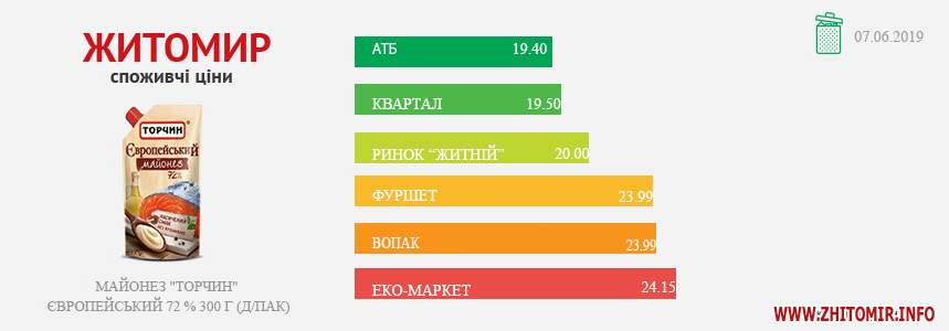 МОНІТОРИНГ ЗДІЙСНЕНО МЕТОДОМ КОНТРОЛЬНОЇ ЗАКУПІВЛІ, У МІСЦЯХ ПРОДАЖУ: AТБ, пр. Миру, 15 А, Ринок "Житній", майдан Житній ринок, Фуршет, вул. Вітрука, 9 а, ЕКО-маркет, вул. Мала Бердичівська, 2/ 7, Квартал вул. Вітрука, 13,Вопак, вул. Київська, 87