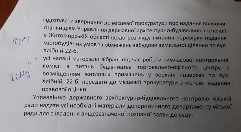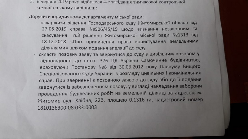 Він розповів про виявлені порушення, зокрема: при підписання договору оренди земельної ділянки, який не відповідає ухваленому депутатами рішенню сесії, а посадовці міської ради, які візували договір, не звернули увагу на невідповідності. Комісія рекомендувала юридичному департаменту міської ради оскаржити договір в суді та подати позов щодо самочинного будівництва на земельній ділянці по вул. Хлібна, 22-б.