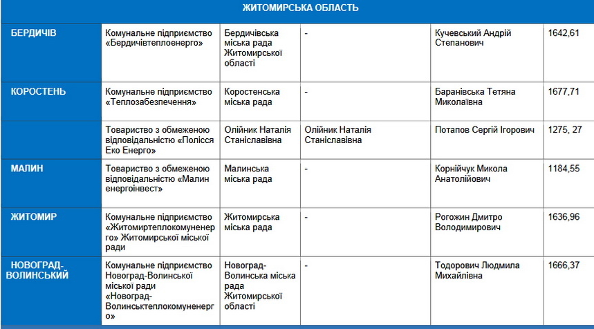 Зокрема, у Житомирській області з шести теплопостачальних компаній є лише одна приватна, яка працює в Коростені – ТОВ «Полісся Еко Енерго», що належить Олійник Наталії Станіславівні. Щодо тарифів, то найвищий він у КП «Теплозабезпечення» Коростенської міської ради – 1677,71 грн/Гкал, найнижчий у ТОВ «Малин Енергоінвест» Малинської міської ради – 1184,55 грн/Гкал.