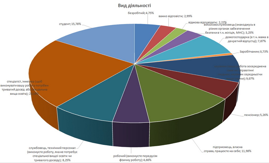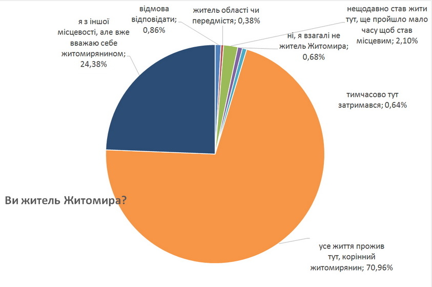 Як бачимо з таблиці вище, 71% учасників опитування – корінні житомиряни, і це значна кількість людей, яка одразу цементує місто. Більш того, у вільних відповідях ми читали неодноразові приклади, що за походженням корінні житомиряни, проживши активне життя по світах, часто повертаються потім жити в Житомир. Це дуже цікавий показник, який свідчить, що ми не просто місто, яке побудоване навколо якогось промислового підприємства, як це часто було в Радянському Союзі. А ми місто зі своїми традиціями. 25% живуть тут від 5 до 10 років і вже вважають себе житомирянами. Цьому сприяє також те, що, як правило, ці люди з Житомирщини, тобто тут перехід дуже природній.