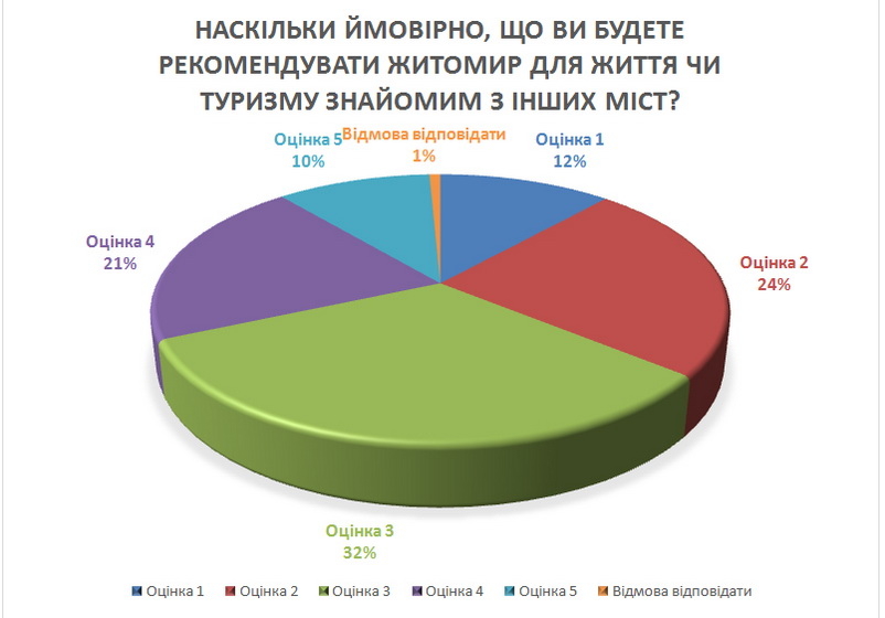 Коли стоїть питання порекомендувати Житомир для інших, для туризму, то тут думка людей цікаво змінюються. Частина людей ставить більш високу оцінку – зростає показник «5» балів, і разом з тим зростає кількість тих, хто ставить «1» і «2» такій можливості. Це означає, що людина живе у місті, звикла, і ніби їй нічого не муляє, усе «на трієчку», але коли місто необхідно порівняти з іншими містами, то ось тут люди схильні більш об'єктивно оцінювати своє задоволення від проживання у місті. Оцінка одразу зменшується.