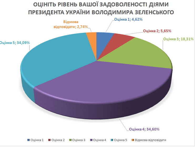 Як бачимо, якщо відносно курсу країни спостерігається доволі великий песимізм, то довіра до Зеленського, до його дій набагато вища. Щодо країни, то респонденти зараз перебувають у невизначеній ситуації: 50% не знають, чи правильно зараз йдуть справи в державі. Це скоріше відображає те, що люди очікують до яких конкретних наслідків з часом приведуть сьогоднішні дії Президента та його команди. Сподівання від Зеленського залишаються високими і співвідносні з тим результатом, який він отримав на президентських виборах: позитивні оцінки «4» і «5» разом дають майже 70% підтримки.