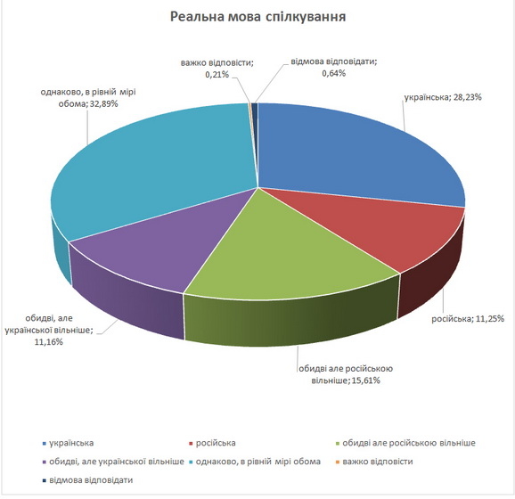 Як бачимо з цієї діаграми, 28% житомирян вважають рідною мовою українську, 11% вважають російську своєю рідною і основною мовою, 16% українську розуміють, але скоріше за все говорять на ній неприродно.