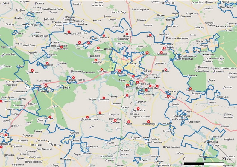 Червоним помічене місце відбору проб води (проби відбиралися у закладах дошкільної освіти та двох криницях зазначених сільських населених пунктів Житомирського району)