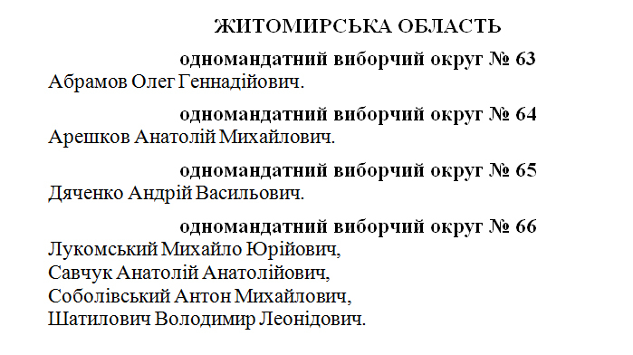 Як повідомляв Житомир.info, на момент завершення ЦВК реєстрації в шести одномандатних округах Житомирської області було 76 кандидатів, станом на ранок 11 липня залишилося 74 кандидати: 44 самовисуванці та 30 від політичних партій. Найбільше кандидатів у Малинському ОВО №66 (19) та у Житомирському ОВО №62 (18). В Коростенському ОВО №64 та Новоград-Волинському ОВО №65 будуть бюлетені з позначкою «вибув».