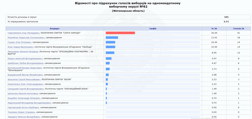 По ОВК №62 (м. Житомир) опрацьовано 5,7% протоколів. За їхніми даними – лідирує Ігор Герасименко, за якого проголосували 30,6% виборців, на другому місці Борислав Розенблат – 13,4%, далі з однаковою кількістю голосів – Ігор Гундич та Сидір Кізін – по 10,4%.