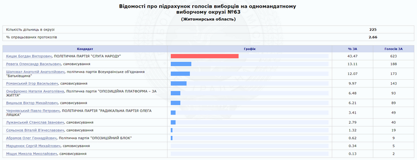 По ОВК №63 (Бердичів) лідирує Богдан Кіцак – 43,5%, Олександр Ревега – 13,1%, Анатолій Шаповал – 12,1%.