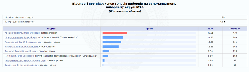 По ОВК №64 (Коростень) лідирує Володимир Арешонков – 26,3%, Вячеслав Сігачов– 21,9%, Сергій Пашинський – 19,8%.