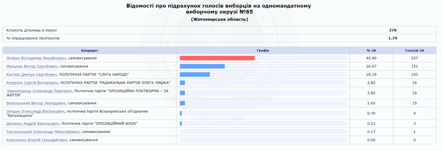 По ОВК №65 (Новоград-Волинський) лідирує Володимир Литвин – 45,4%, Віктор Мельник – 26,7%, Дмитро Костюк – 18,2%.