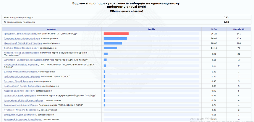 По ОВК №66 (Малин) лідирує Тетяна Грищенко – 26,3%, Анатолій Павленко – 24,0%, Віталій Журавський – 18,6%.