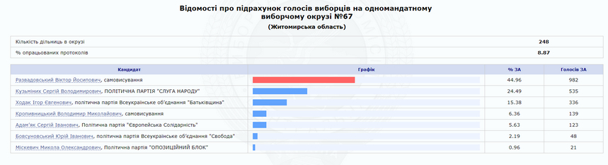 По ОВК №67 (Чуднів) лідирує Віктор Развадовський – 44,9%, Сергій Кузьміних – 24,5%, Ігор Ходак – 15,4%.