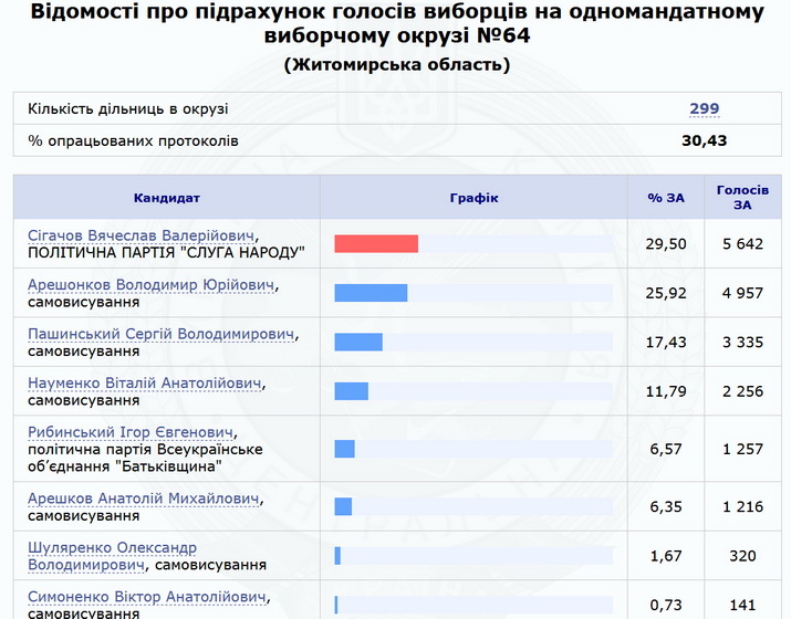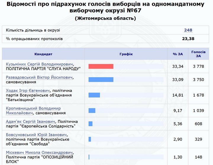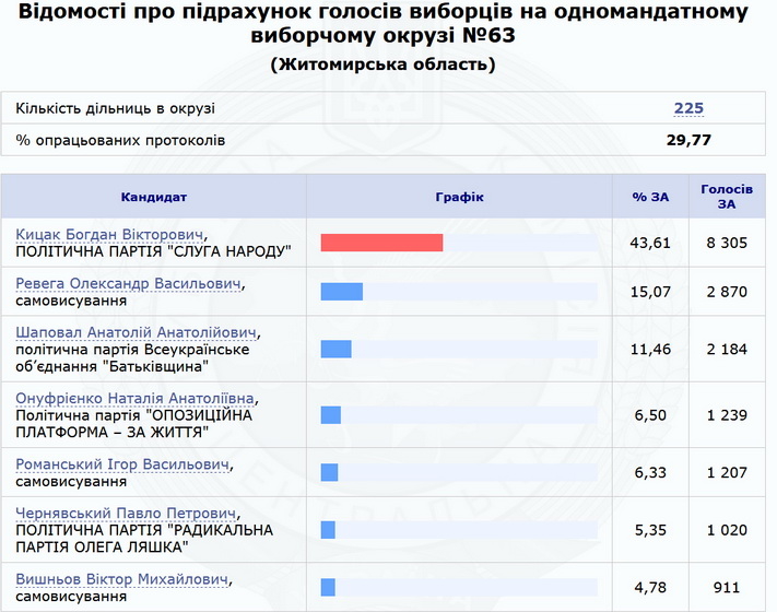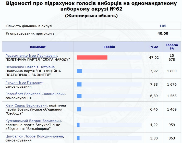 Нагадаємо, 21 липня близько 23:00 Центральна виборча комісія почала оприлюднювати перші результати голосування на округах у Житомирській області. Близько 2-ї години ночі 22 липня на сайті ЦВК були результати 10% протоколів з шести округів області. За даними паралельного підрахунку голосів, за результатами 100% протоколів в окрузі №62 (Житомир) перемагає Ігор Герасименко («Слуга народу»), в окрузі №67 (Чуднів) – Сергій Кузьміних («Слуга народу»).