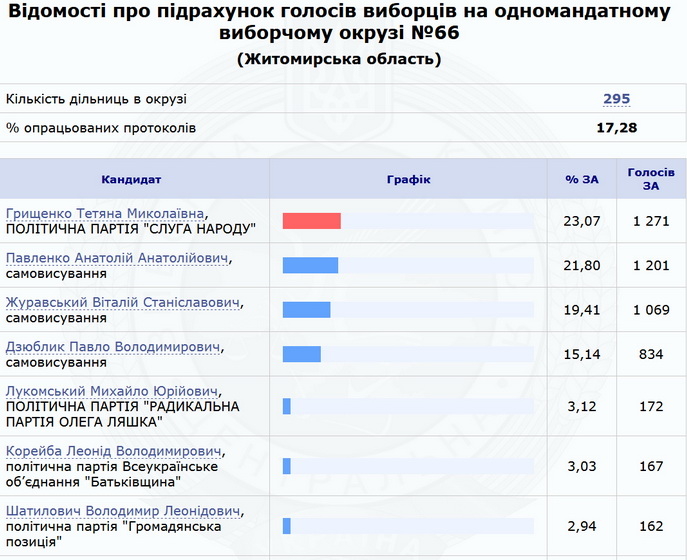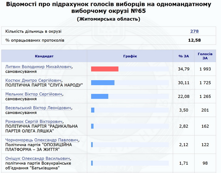 Найшвидше надходять результати з Житомирського округ №62, де вже є 40% протоколів дільничних комісій, найповільніше передають дані з Новоград-Волинського округ №65 – лише 12,58%.