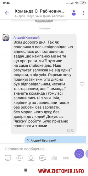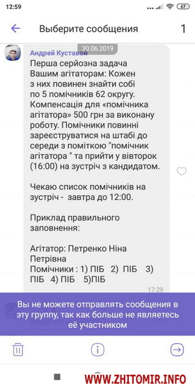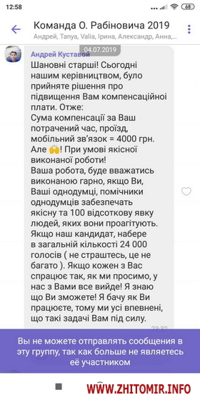 Журналістам також демонструють скрінтоши чату у Viber, де старші агітатори отримували вказівки від кураторів. Тут також інформували про плату, про компенсацію за час, проїзд, мобільний зв’язок у вигляді 4000 тисяч гривень, однак при умові «якісної» роботи. І наостанок – повідомлення про те, що всю кампанію «пустили на дно». Після цього, за словами агітаторів, чат у Viber був видалений.