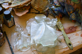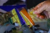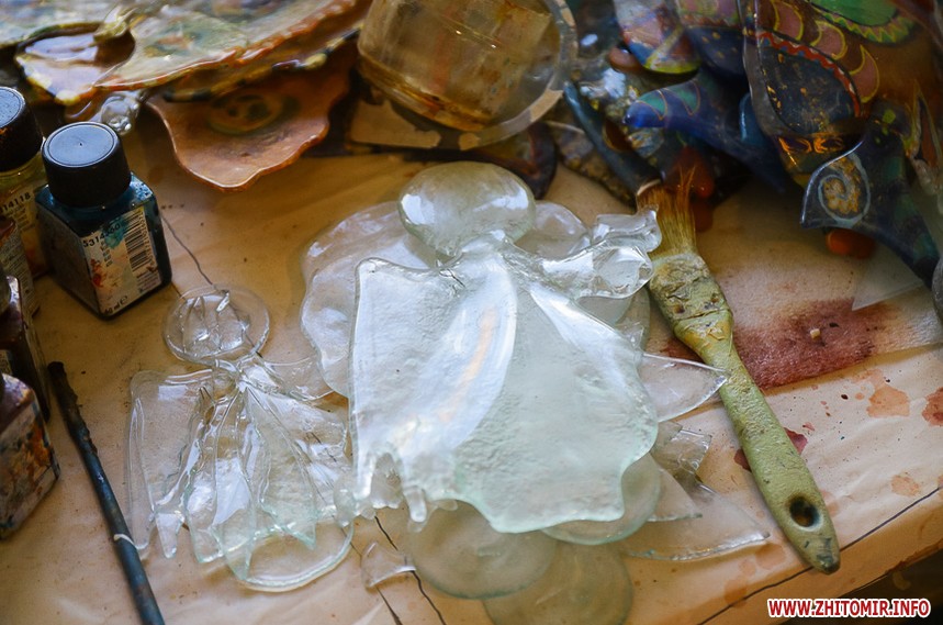 Зазвичай використовую спеціальне скло. Проте не відмовляюся і від випадкових. Мені, як експериментатору, хочеться спробувати різне в роботі. Зараз ф’юзинг отримав великий розвиток, є спеціальне ф’юзингове скло, художнє скло, малесенький шматочок якого може коштувати і півтори тисячі гривень, і сім тисяч гривень – для художньої ювелірки. Буває, плавлю з картинами напівдорогоцінне каміння. Потрібно знати їх фізико-хімічні властивості, наприклад, опали змінюють колір при нагріванні. Ти не лише створюєш художній образ, але й використовуєш для цього цікаву фізику та хімію.