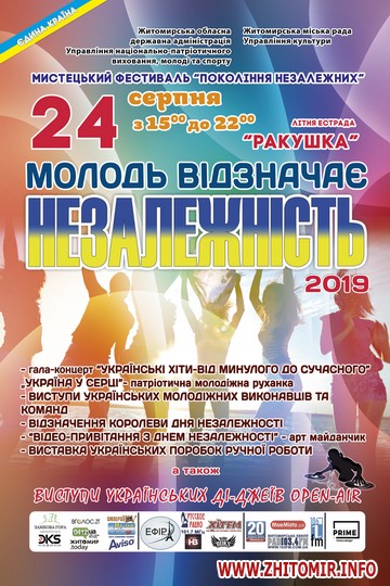 Традиційно у День Незалежності України, 24 серпня, у літньому театрі "Ракушка" та прилеглій до нього території міського парку культури та відпочинку ім. Ю. Гагаріна краща творча молодь Житомирщини проведе щорічний молодіжний фестиваль "ПОКОЛІННЯ НЕЗАЛЕЖНИХ–2019". Серед організаторів - управління національно-патріотичного виховання, молоді та спорту Житомирської облдержадміністрації, управління культури Житомирської міськради, молодіжні організації, волонтери та громадські активісти.