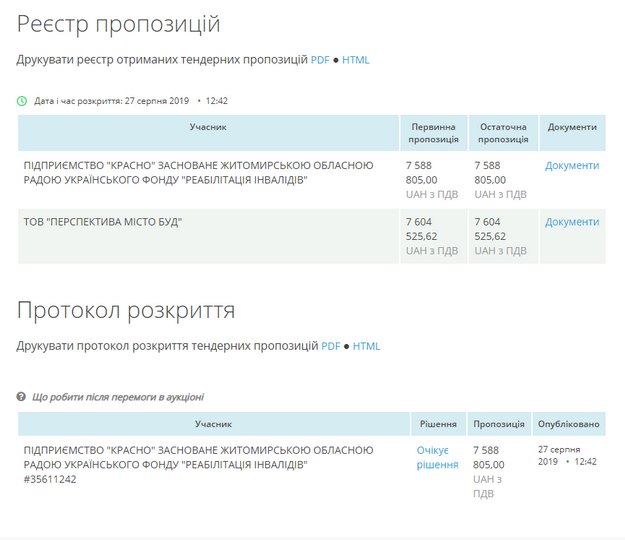 27 серпня відбувся аукціон, у якому взяли участь дві фірми. Вигіднішою виявилась пропозиція підприємства «Красно» заснованого Житомирською обласною радою українського фонду «Реабілітація інвалідів», у 7 млн 588,8 тис. грн. Тож наразі дане підприємство очікує на остаточне рішення тендерної комісії.