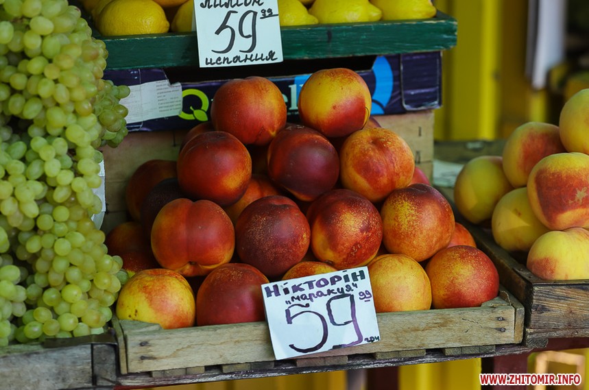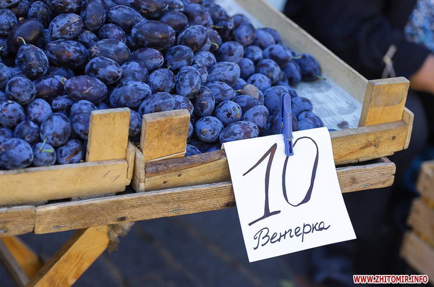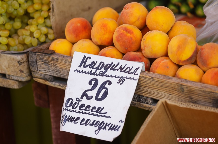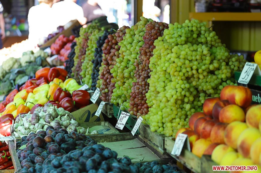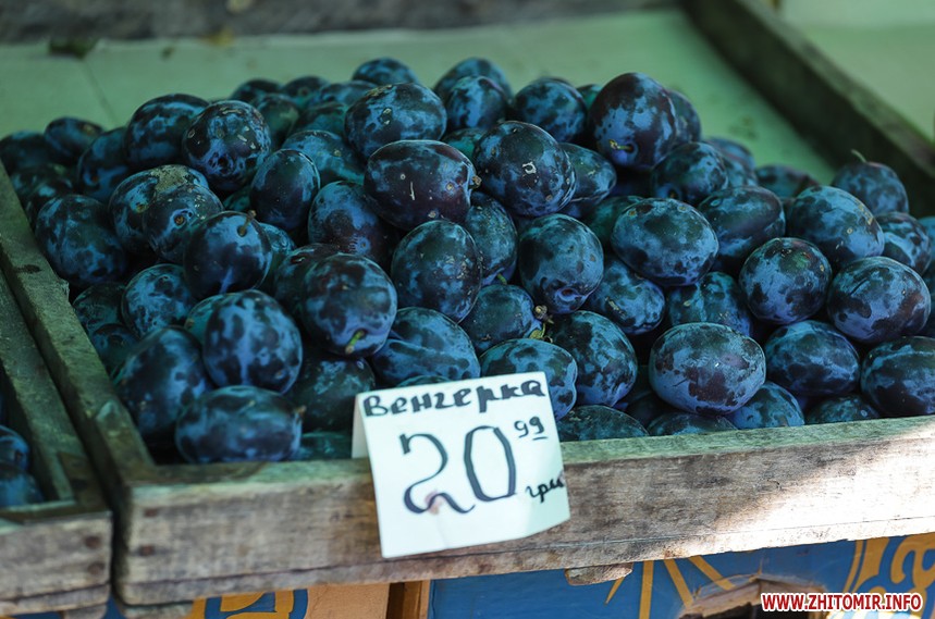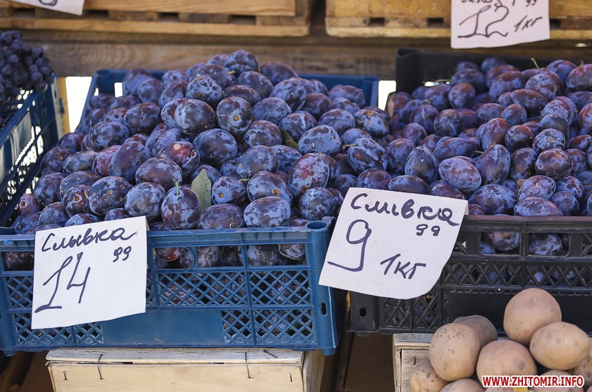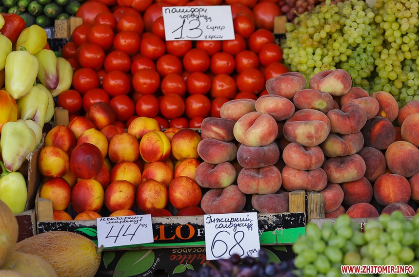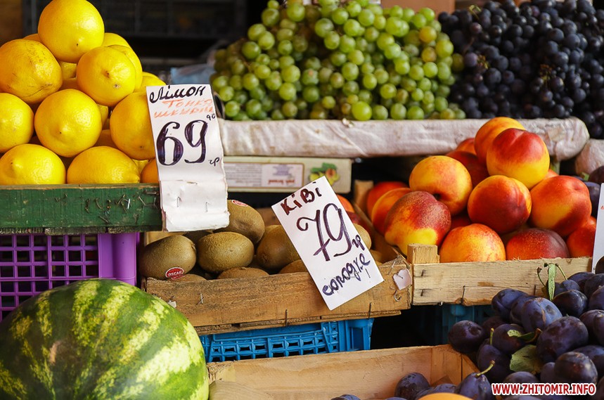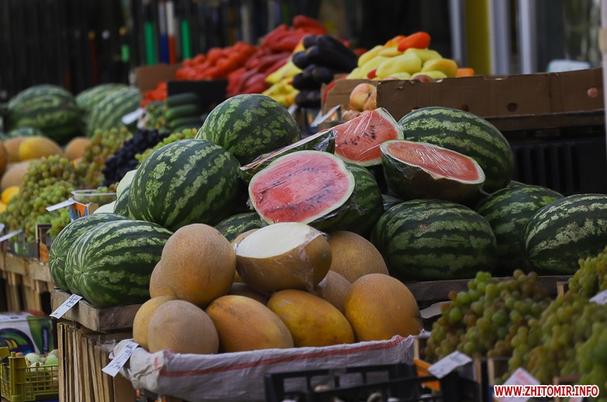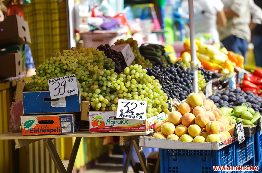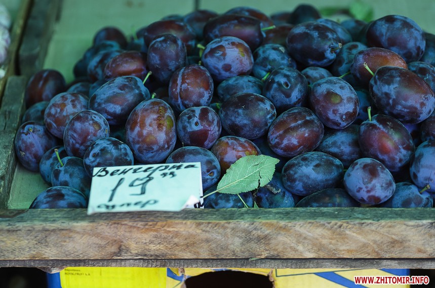 Сливи, персики, нектарин, банани, ківі, кавуни, дині, виноград різних сортів, а ще кизил, малина, ожина і навіть полуниця – від різноманіття асортименту фруктів-ягід на Житньому ринку в Житомирі розбігаються очі. Серпень-вересень – просто «райський» період для любителів соковитих, ароматних та апетитних плодів.