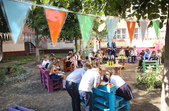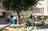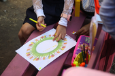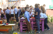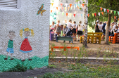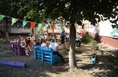 Облаштувати зручні зони, де діти можуть і навчатися, і відпочивати, і проводити час на групі продовженого дня, вдалося зі звичайних дерев’яних піддонів, які відшліфували і пофарбували у різні кольори. Один такий клас під відкритим небом має ще й шкільну дошку.