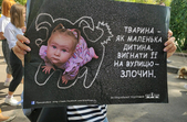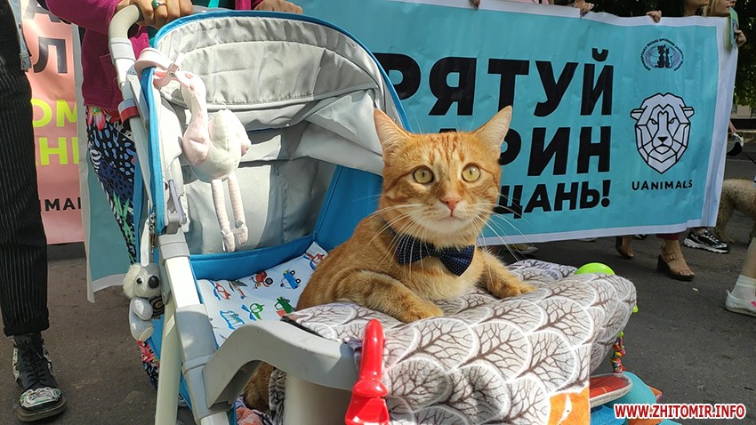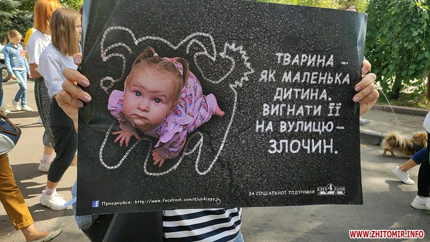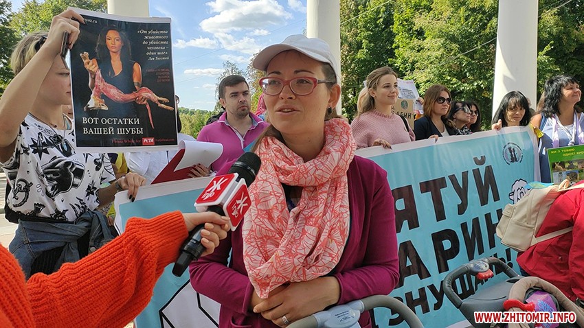 Більше сотні учасників акції у Житомирі разом із домашніми тваринами пройшлися по Старому бульвару, вигукуючи гасла «Захист слабких – справа сильних», «Ми за цирк без тварин» та «Хутро – криваве жлобство».